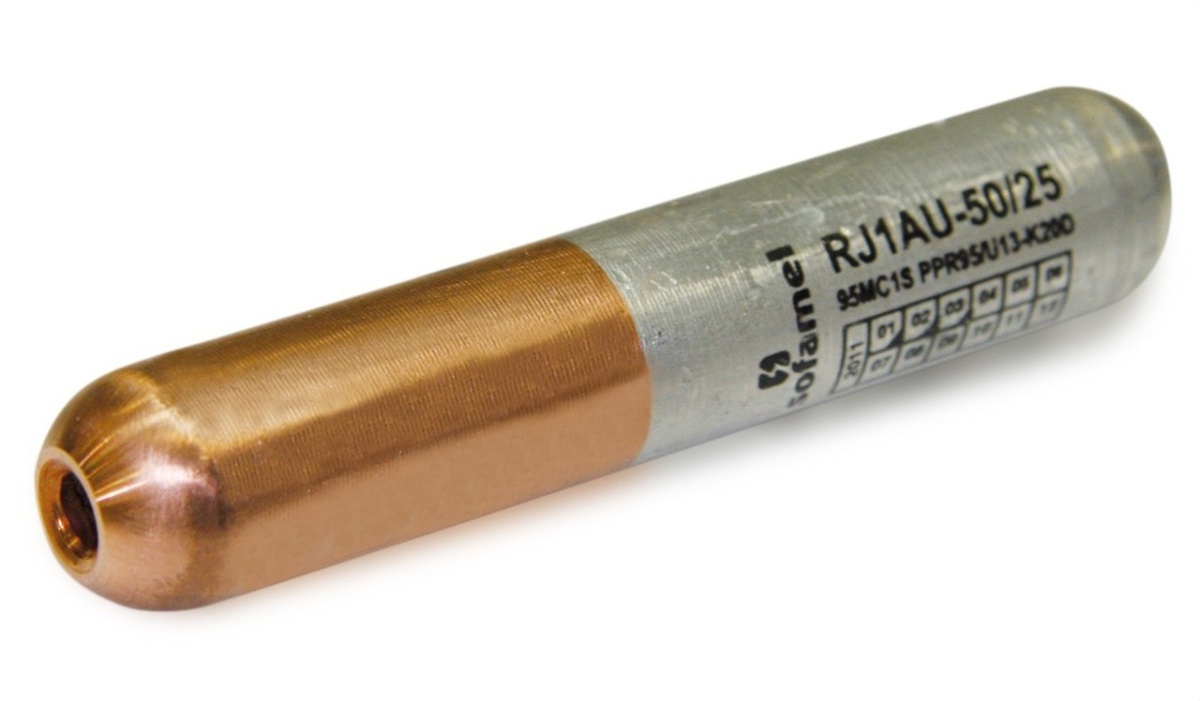 El manguito bimetálico RJAU 95/50 está fabricado en aleación de aluminio de pureza igual o superior al 99,5% y tubo de cobre electrolítico. Mediante un proceso de soldadura por fricción se unen ambos materiales formando el manguito bimetálico. Lleva incorporada grasa neutra en el agujero de la parte de aluminio para evitar la oxidación del mismo. Diseñados para conexiones en baja y media tensión