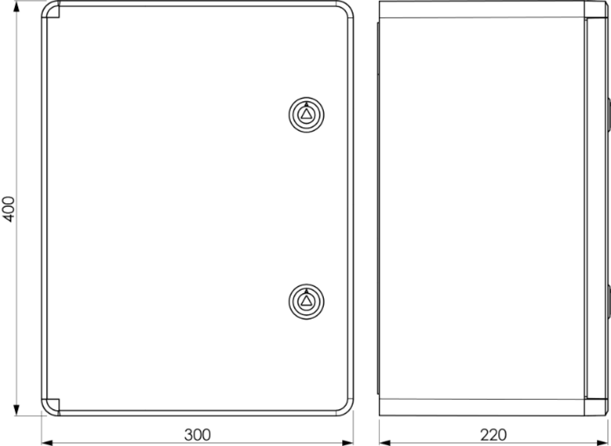 Caixa estanque termoplástica. Porta lisa (opaca). Dimensões externas 300x400x220. Com placa de metal.